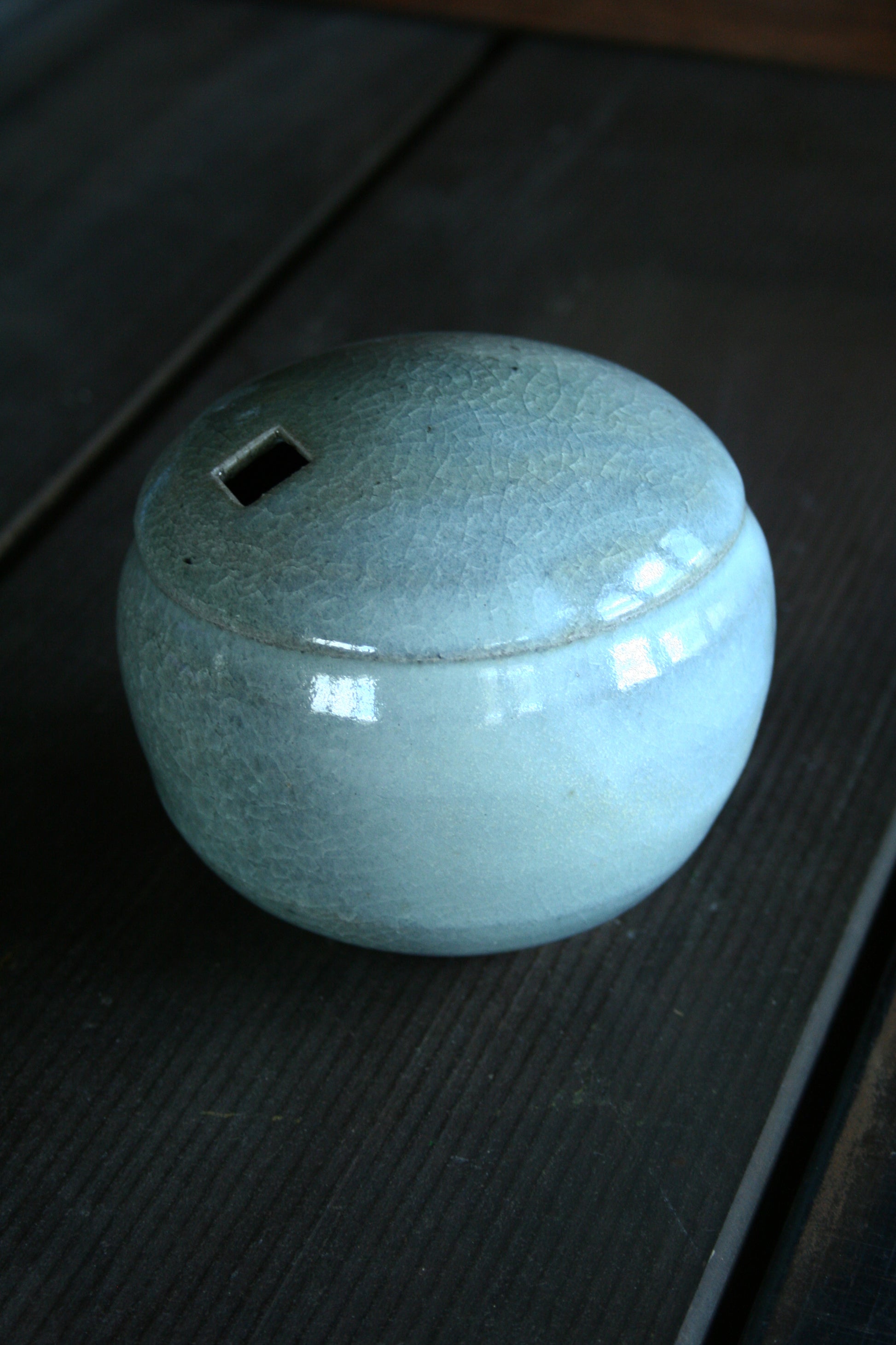 Enclosed form vase in pale blue crackle glaze